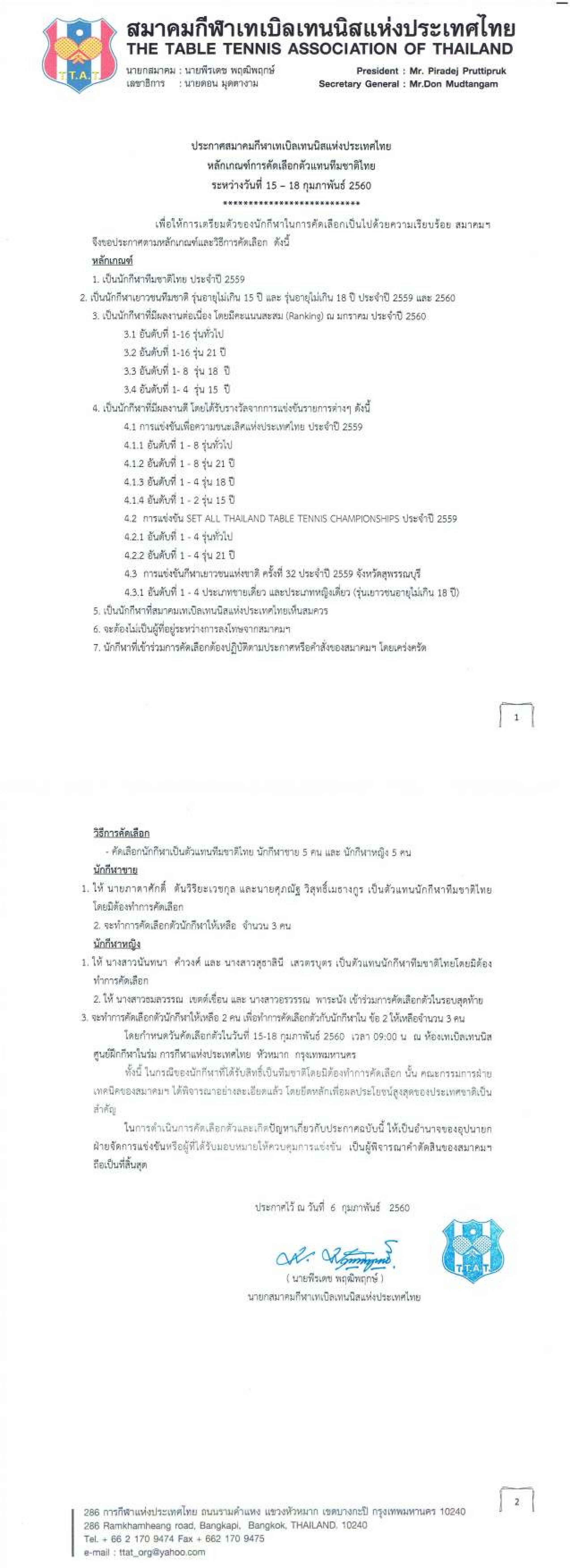 รายชื่อนักกีฬาที่ยืนยันสิทธิ์การคัดเลือกนักกีฬาเทเบิลเทนนิสทีมชาติไทย
