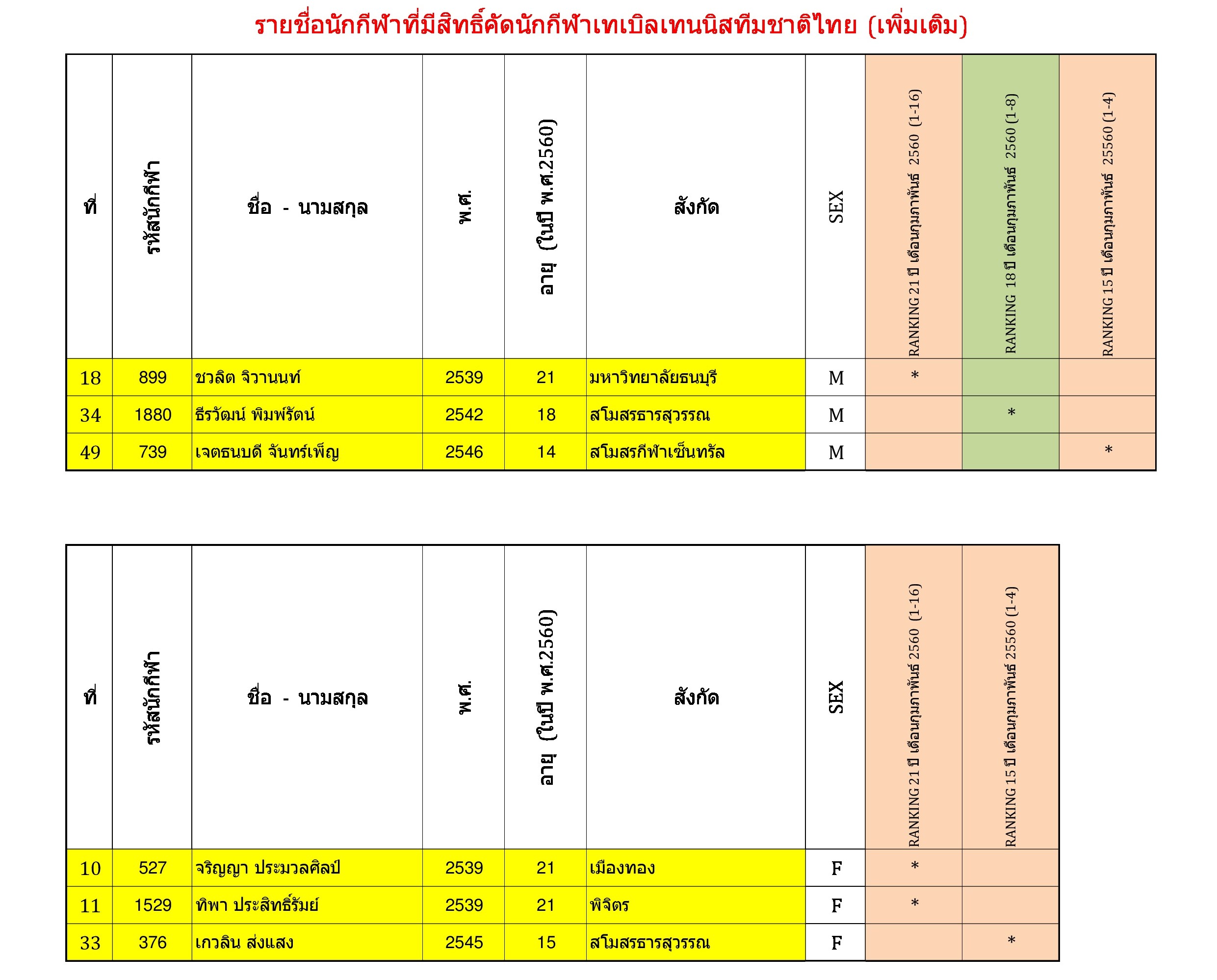ตรวจสอบรายชื่อนักกีฬาที่มีสิทธิ์คัดเลือกนักกีฬาทีมชาติไทย